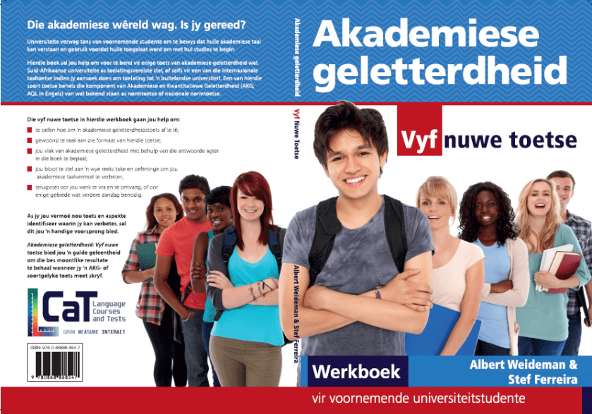 Graad 10-12’s: Hier is ‘n werkboek vir jou om solank te oefen vir die NBT AKG-toets — met vyf volledige voorbeeldtoetse en antwoorde. Hou in gedagte dat die boek geskryf is om jou voor te berei vir enige toets van akademiese geletterdheid, ook die wat internasionaal vereis word, soos TOEFL and IELTS. Dit sluit ook een of twee subtoetse in wat nie tipies deur die NBT’s gedek word nie, maar wat jou akademiese taal en denkstrategie sal opskerp. [Also available in English.]